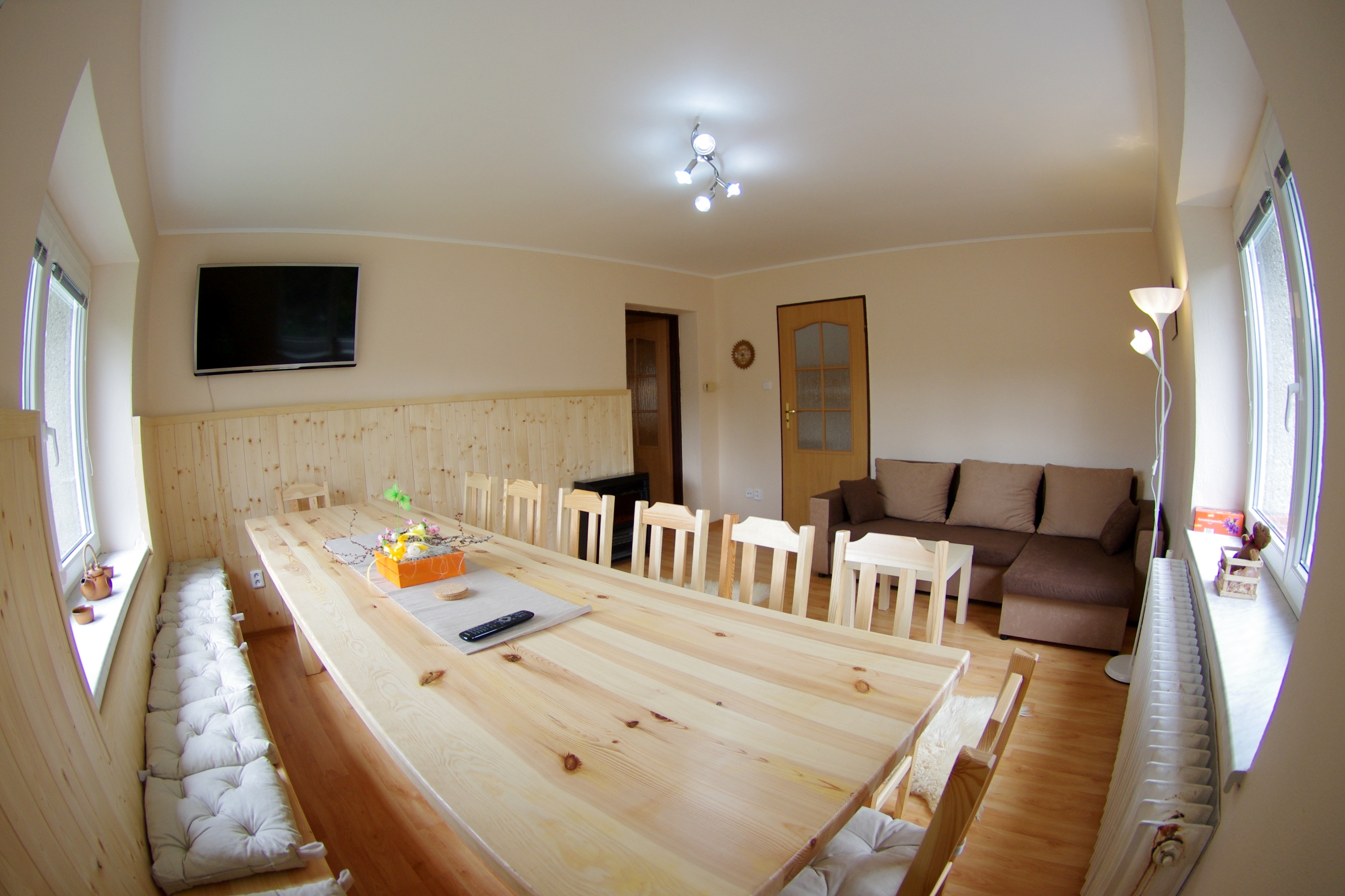 Vybavení: 6 pokojů (4,4,3,3,3,2), 3x koupelna, 3x wc, vybavená kuchyně (myčka, lednice s mrazákem, mikrovlnná trouba, multifunkční trouba, 24 sad nádobí a příborů, kontaktní gril ..), spižírna s další lednicí, šatna, kulturní místnost (jídelní stůl, sedací souprava, 120 smart LED TV s 100 SAT programy v češtině, elektrický krb), wellness (infra sauna, hydromasážní vana, solné doplňky), v suterénu vinný sklípek s posezením. Wifi v celém objektu.