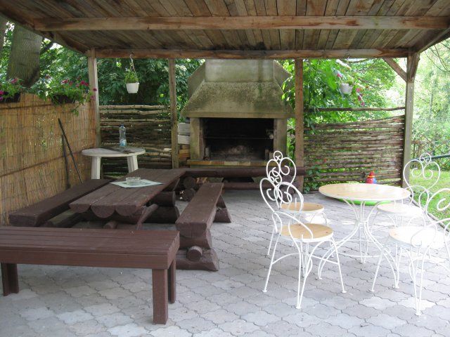 Ve venkovním areálu máme dětské houpačky a posezení s krbem.