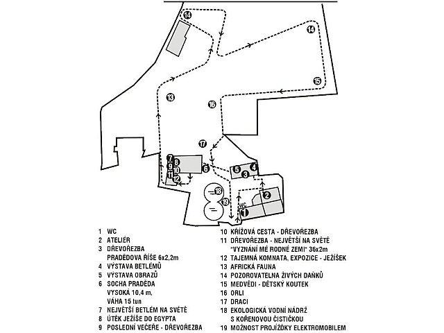 Na osmi hektarech se rozkládá galerie, ve které shlédnete 450 vyřezaných plastik zvířat a hlavně betlém v životní velikosti, který již čítá 236 soch a váží 20 tun. Nechybí zde ani slon či velbloud v životní velikosti. Sochy uvidíte umístěné převážně v krytých prostorách a v zahradách jsou také kromě soch umístěny atrakce pro děti, jako jsou houpačky, prolézačky a kolotoče. Z pozorovatelny můžete sledovat chov daňků. Dominantou celé galerie je socha vládce jesenických hor - Děd Praděd, který se tyčí do výše 10,4 metrů a váží okolo 15 tun. Za třetí unikát je považován obraz Děda Praděda a jeho říše.